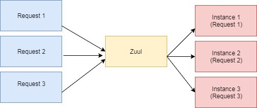 Each request received by Zuul is forwarded to a different instance in a round robin fashion.